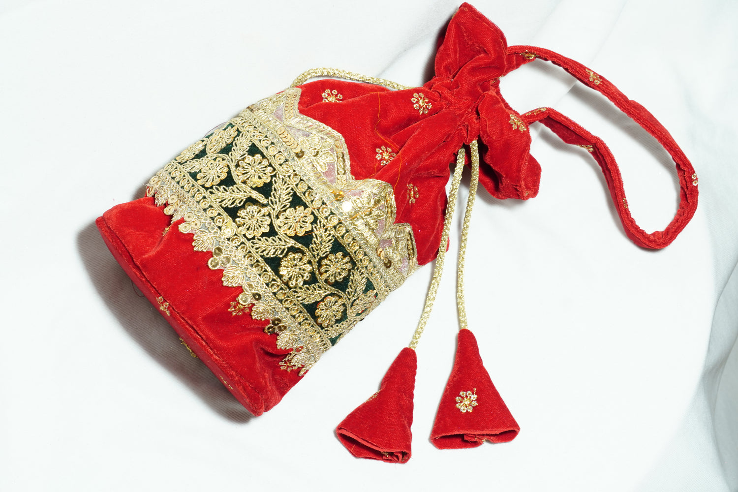 Potli is a small traditional drawstring bag, often made of silk or brocade. In Uttarakhand, it complements bridal wear like lehenga or saree, used to carry essentials. Decorated with embroidery, beads, or mirror work, it adds a festive touch to ethnic outfits.