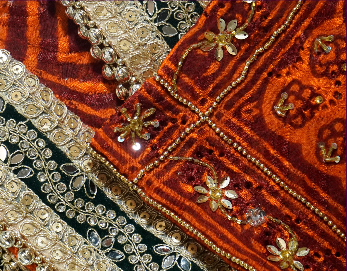 A traditional Uttarakhand lehenga features rich fabrics like silk, deep colors (red, maroon, orange), and hand embroidery with motifs like flowers and peacocks. It’s often paired with the iconic pichora dupatta—a saffron-red bandhani cloth with auspicious symbols. Jewelry includes a nath, heavy earrings, and pahadi headgear. Perfect for weddings and festivals.